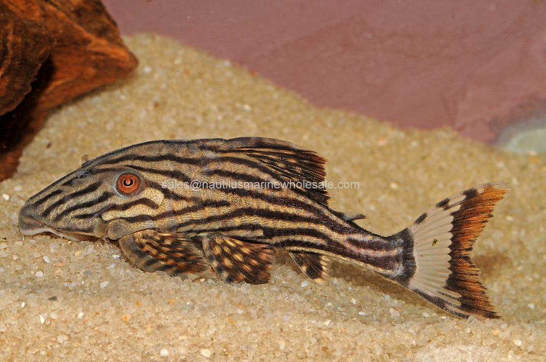 SCIENTIFIC NAME: PANAQUE NIGROLINEATUS The Royal Plecostomus is a handsome suckermouth catfish belonging to the Genus Panaque. A classic representative of this genus, the Royal Plecostomus is a stout, muscular fish with a distinct "tadpole" shape. Compared to other Loricariids, members of the Genus Panaque sport a truncated body with a pronounced anterior that gives them a "top-heavy" appearance best seen from the profile view. The Royal Plecostomus, also known as the Royal Panaque, Royal Black-lined Panaque or Broken Line Royal Pleco, has irregular black steaks set upon a deep mossy or cement colored body. This bold and eye-pleasing graphic pattern elevates this very attractive fish to royalty status among Loricariid enthusiasts. The distinct body shape, striking pattern and prominent eyes make the Royal Plecostomus a welcomed change from the usual and a peaceful addition to large freshwater aquariums. Hailing from the rivers and tributaries of South America, the Royal Plecostomus has evolved to exploit fast-moving riparian environments with sunken bogwood (driftwood). Planted aquariums with hardy, fast-growing plants and high aeration and water movement provide a healthy environment. Be sure to aquascape with driftwood and rocks to provide hiding spaces for the Royal Plecostomus. The use of driftwood is essential since natural feeding behavior of the Royal Plecostomus revolves around foraging for food items growing on or encrusting driftwood. A recommended minimum tank of 125 gallons should be provided to house the Royal Plecostomus. Feeding the Royal Plecostomus is not difficult since it is not a picky eater. However, plenty of driftwood should be used in the aquarium housing this fish. As previously mentioned, biological matter such as detritus and algae that forms on and inside of the wood itself makes up a major portion of its diet. Supplement the diet of the Royal Plecostomus with foods that sink to the bottom of the aquarium such as a high-quality flake food, sinking carnivore pellets, sinking algae wafers, freeze-dried bloodworms, and tubifex worms.
