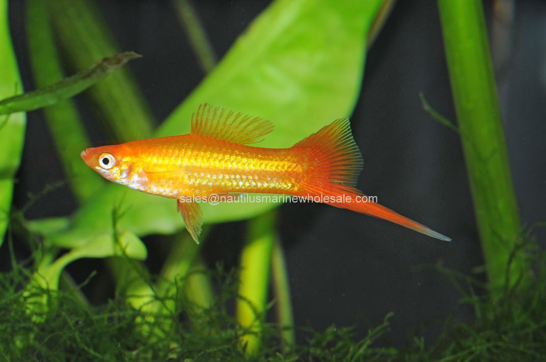 SCIENTIFIC NAME: XIPHOPHORUS HELLERII FLORIDA BRED The Marigold Swordtail is an eye-catching color morph of the popular Swordtail. This variety has a slight to pronounced yellow metallic sheen over a red-orange based body. The Marigold Swordtail is a beautiful and graceful addition to any aquarium. The Swordtail is perhaps the quintessential community aquarium fish, adding interest and color to the passive community aquarium, and makes a perfect addition for the novice to expert alike. The time-tested popularity of the Swordtail can be attributed to its ease of care, hardiness, peaceful temperament, and wonderfully diverse fin and color varieties. The most common Swordtail varieties include: Red Wag, Red Velvet, Black Nubian, Blue, Green, Pineapple and Neon Swordtail. The male Swordtail is especially prized for its namesake feature, the showy extension on the lower part of its tail resembling a sword. The Marigold Swordtail requires an aquarium of at least 20 gallons that is well planted with plenty of room for swimming. Like other Swordtails, the Marigold Swordtail is a jumper, so be sure to provide an adequate cover over the aquarium. Peaceful in nature, the Marigold Swordtail is well suited for the community aquarium. Males can be aggressive toward one another so care should be taken when housing more than one. Marigold Swordtails are livebearers and can give birth to as many as 80 fry at one time. A spawning box is recommended, or if one is not available, dense floating cover should be provided to protect the fry from the adults. The Marigold Swordtail is an omnivore that will eat commercially prepared flaked foods, freeze-dried bloodworms, tubifex, brine shrimp as well as algae.